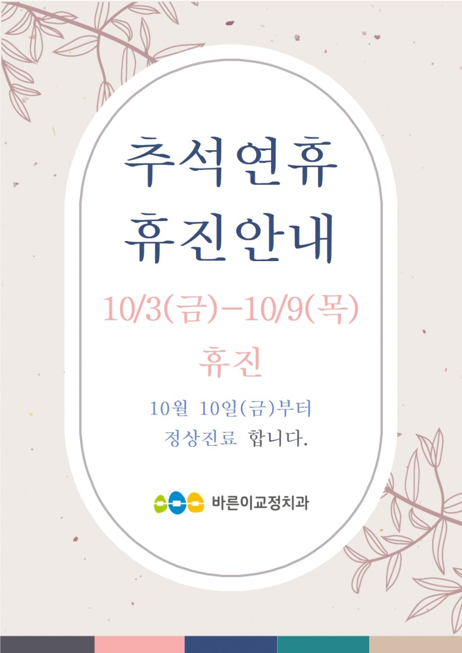 인쇄 스크랩 목록 [공지] 바른이교정치과 추석연휴 휴진안내 [10/3(금)-10/9(목)] 페이지 정보 바른이교정치과 75 0 2025-09-25 11:57:14 본문 인쇄 스크랩 목록 이전글 ▲[공지] 바른이교정치과 10월 진료일정 및 휴진안내 다음글 ▼바른이교정치과 가족여러분~ 제6회 브레이스 스마일 컨테스트에 응모하세요~ 댓글목록 등록된 댓글이 없습니다. 이전글 다음글 목록