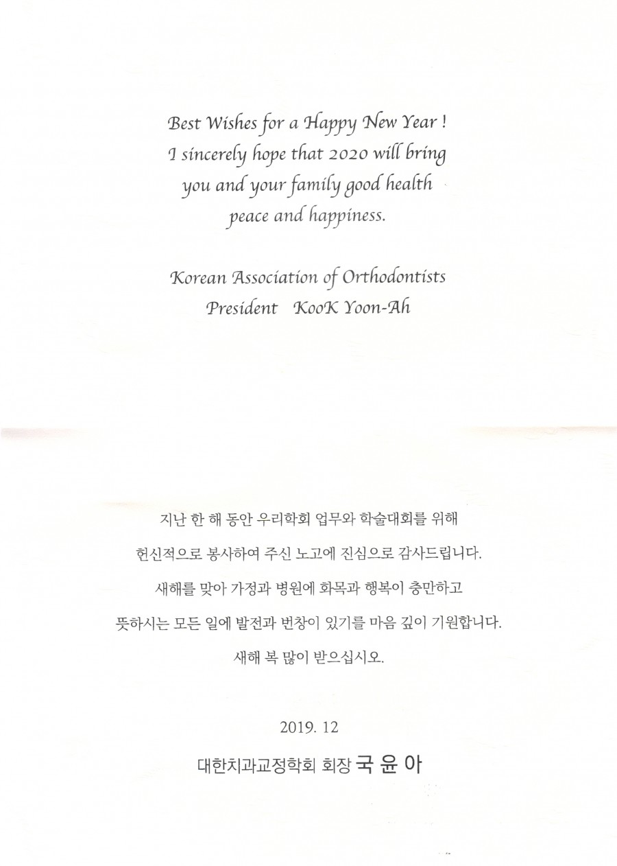 대한치과교정학회 회장님께서 2020년 새해를 맞이하여 교정학회 법제위원으로 활동하고 계시는 원장님께 그동안의 노고에 감사드리며 새해 만복을 기원하는 신년카드를 보내주셨습니다.