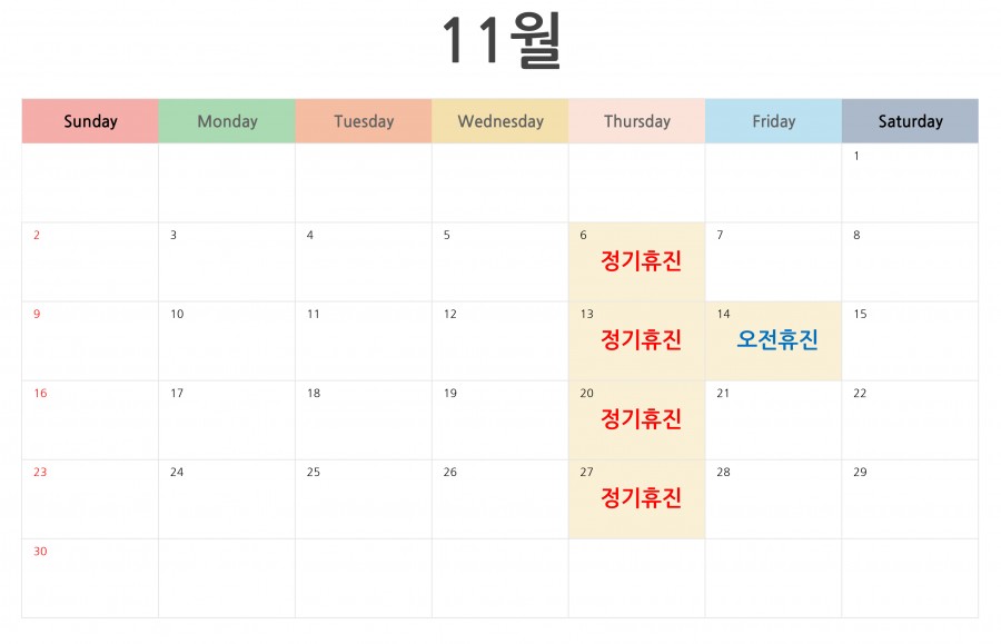 매주 목요일은 바른이교정치과 정기휴진일인 관계로 11/6(목), 13(목), 20(목), 27(목)은 휴진입니다.