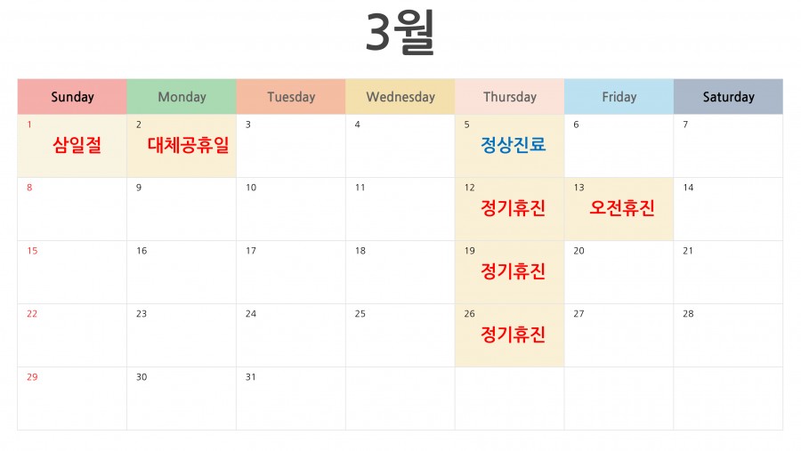 대체공휴일이 있는 주인 3/5(목)은 정상진료하오니 일정에 참고하시기 바랍니다.